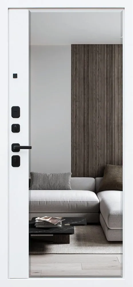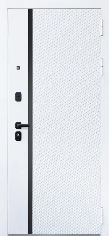 Порошковое покрытие "муар белый". Экошпонированная панель МДФ 10 мм (дизайн ФЛС). Цвет "белый матовый". Вертикальная вставка из черного глянцевого лакобеля. Объемная фрезеровка. Наличник гладкий, МДФ 80 мм.